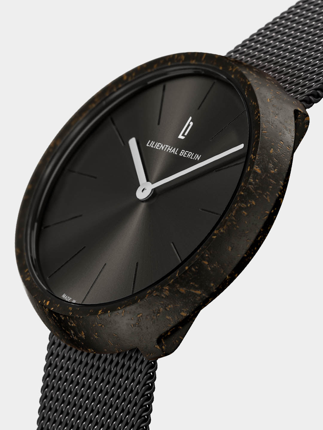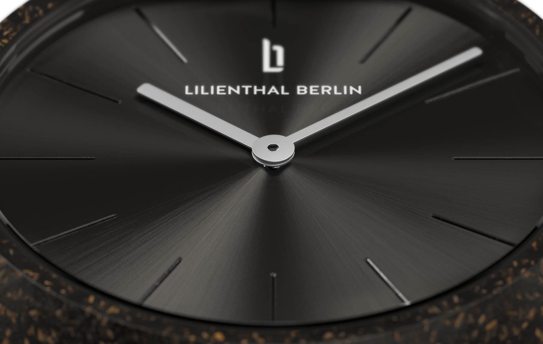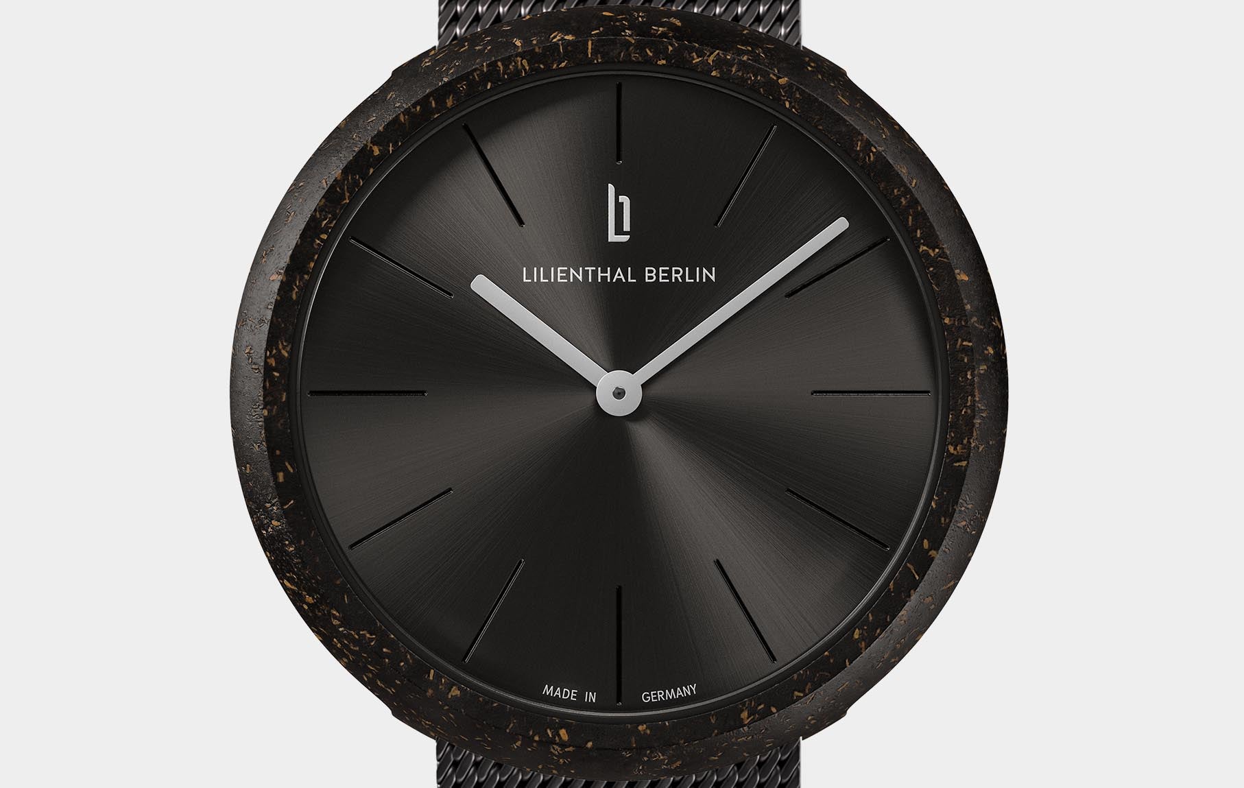 Made of recycled coffee grounds, the watch case is reminiscent of a coffee bean or a coffee cup, depending on how you look at it. The especially round, minimalist appearance of the watch was created using a special trick: the crown is completely recessed into the case back. The pure, straightforward design philosophy is greatly enhanced by the clean, silvery sunburst pattern of the watch face and neatly engraved hour marks.