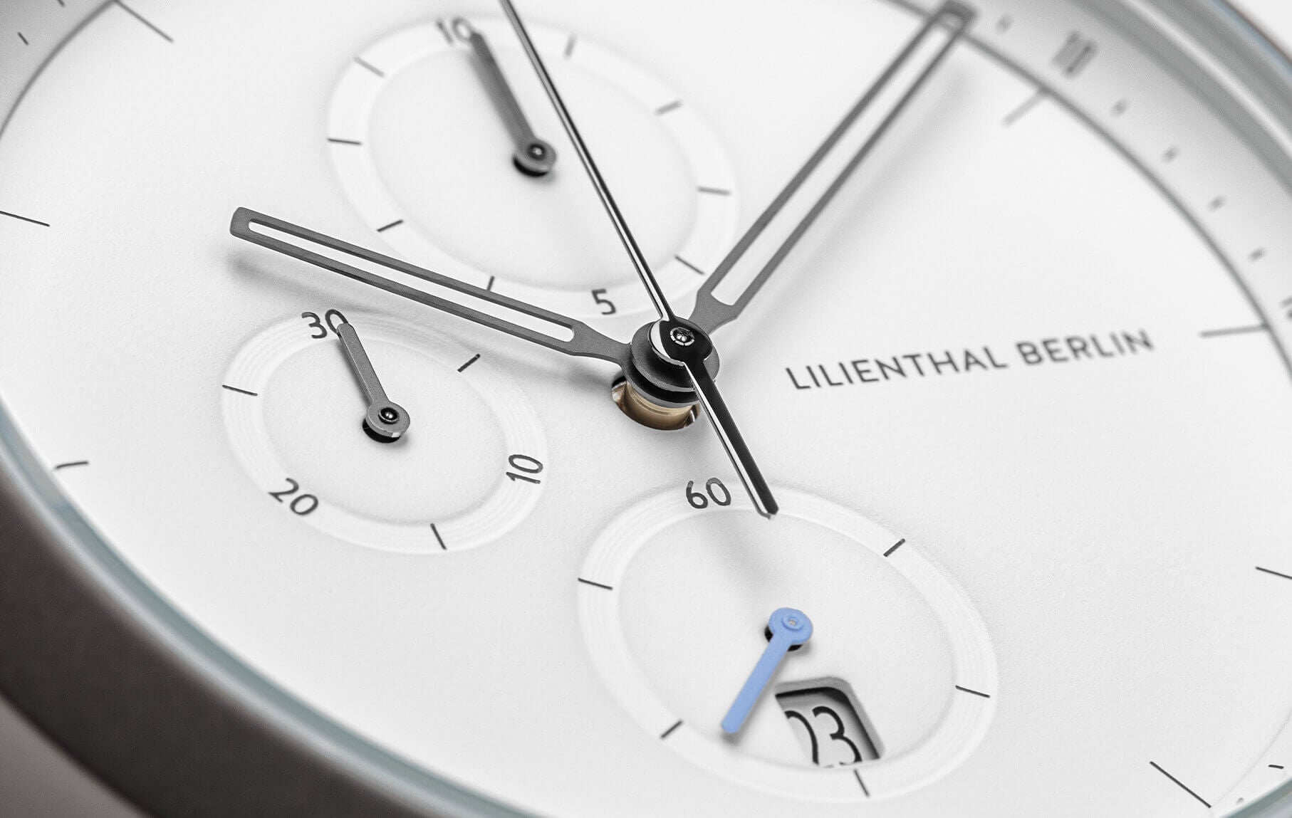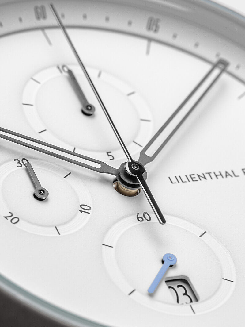 The streamlined dark silver case. The matte white beveled dial. The dark silver indices. The timer function displays accentuated with subtle indentation. The separate seconds dial. The date window placed at 6 o'clock. By playing with three-dimensional structures and fluid transitions, the Chronograph blends typical urban elegance with sporty, dynamic looks.