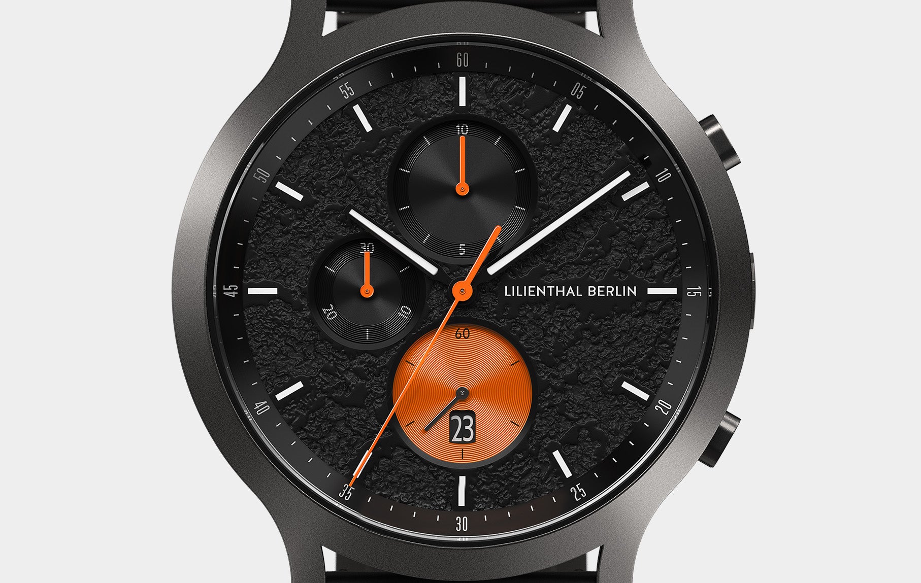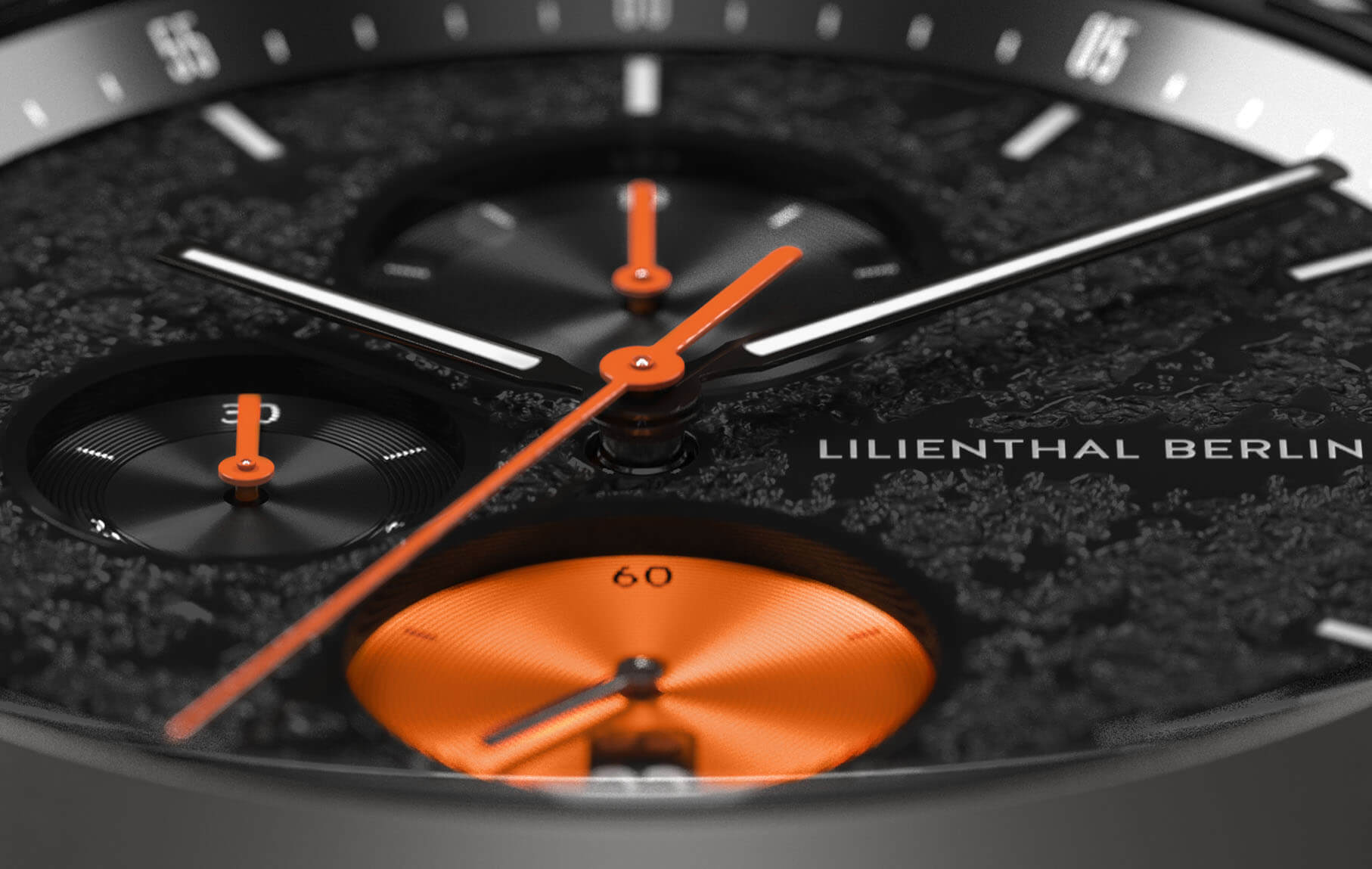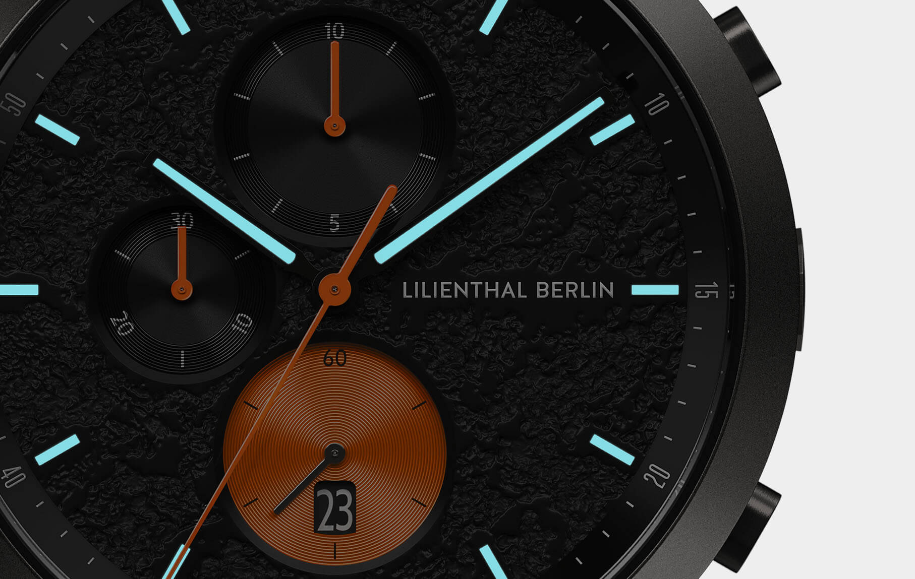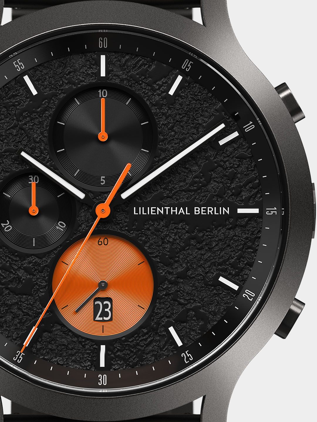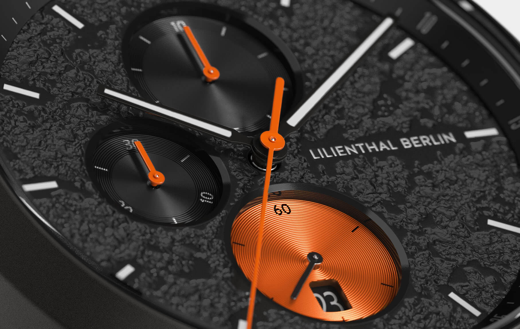 Raw power and force: the black dial is designed with a plastic structure to make it look like liquid lava has solidified inside the watch. The sun-cut stopwatch indices shine like metal. Bright orange elements create a flaming look, while glow-in-the-dark Superluminova provides an extra jolt of heat!
