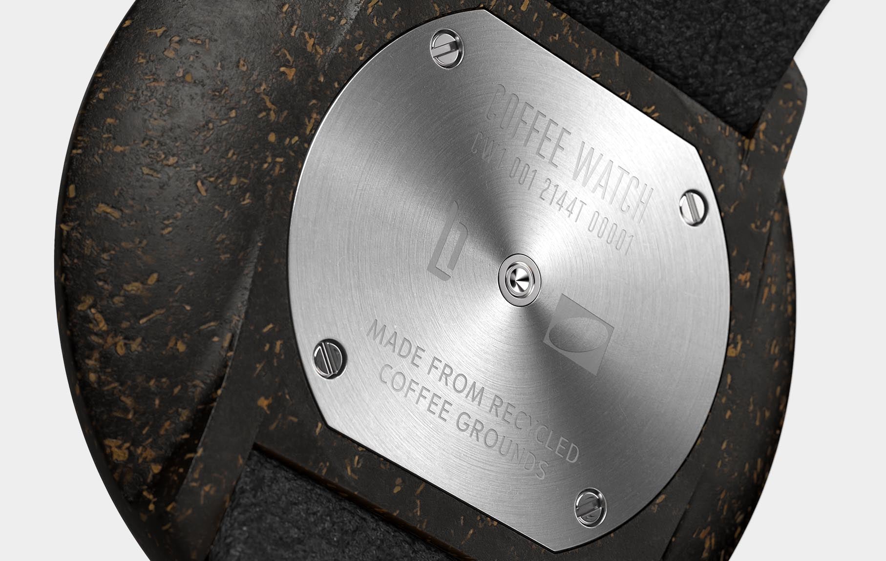 The watch case is made from used coffee grounds, which are transformed into a durable material using a unique upcycling process developed by Kaffeeform.