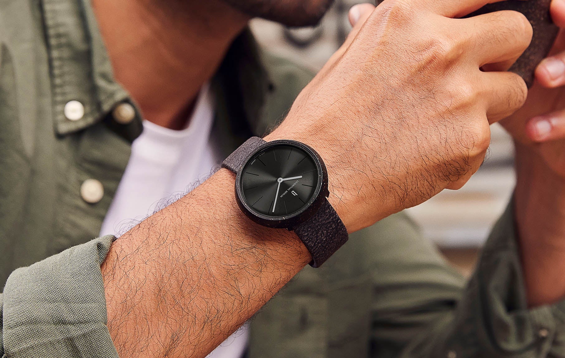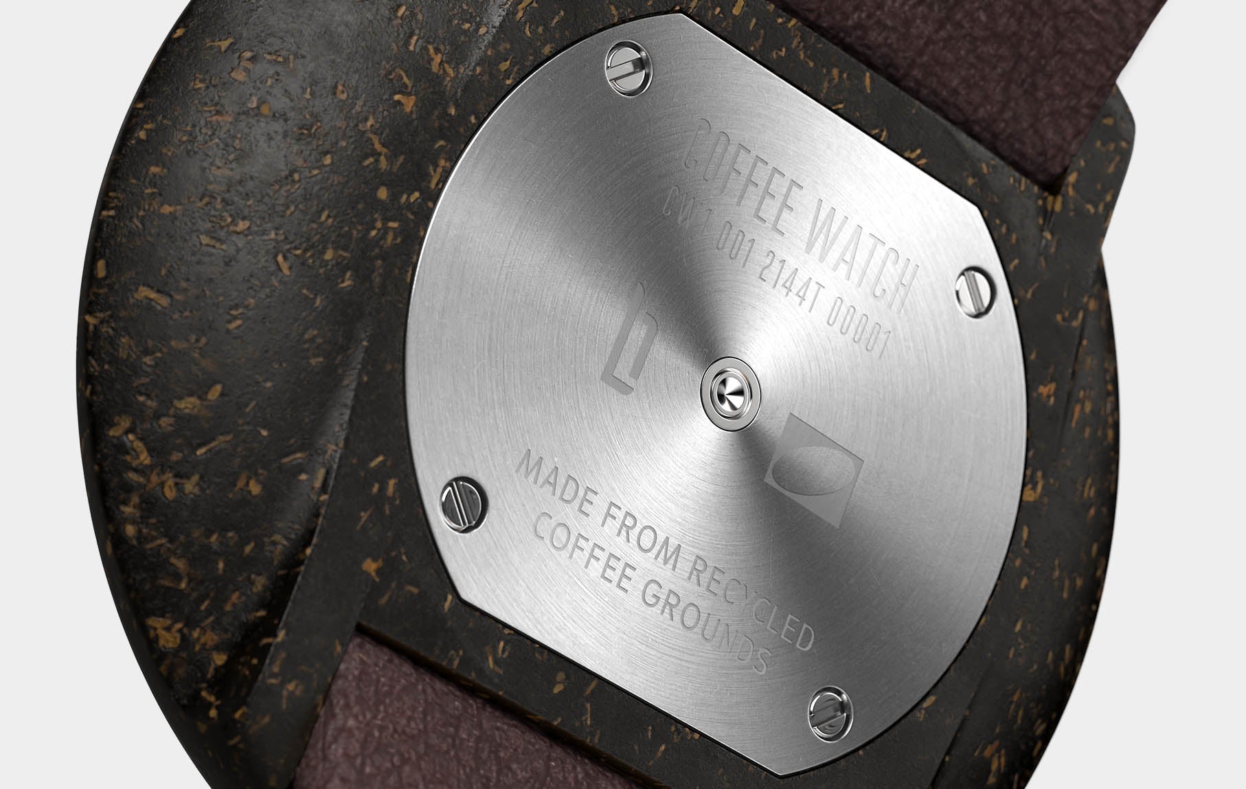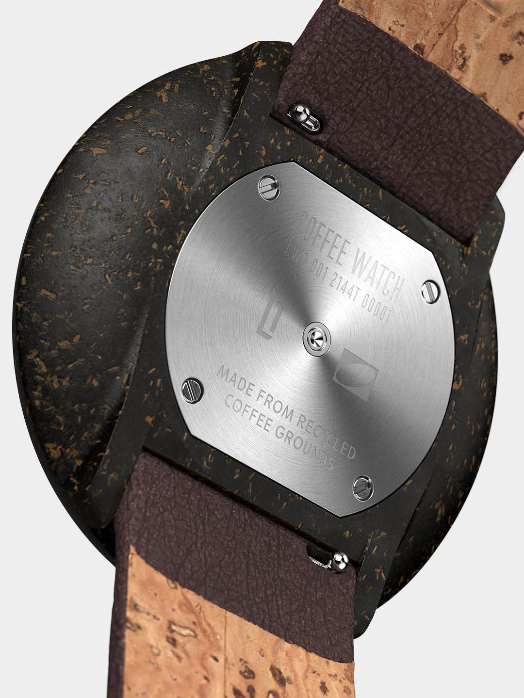 The watch case is made from used coffee grounds, which are transformed into a durable material using a unique upcycling process developed by Kaffeeform.