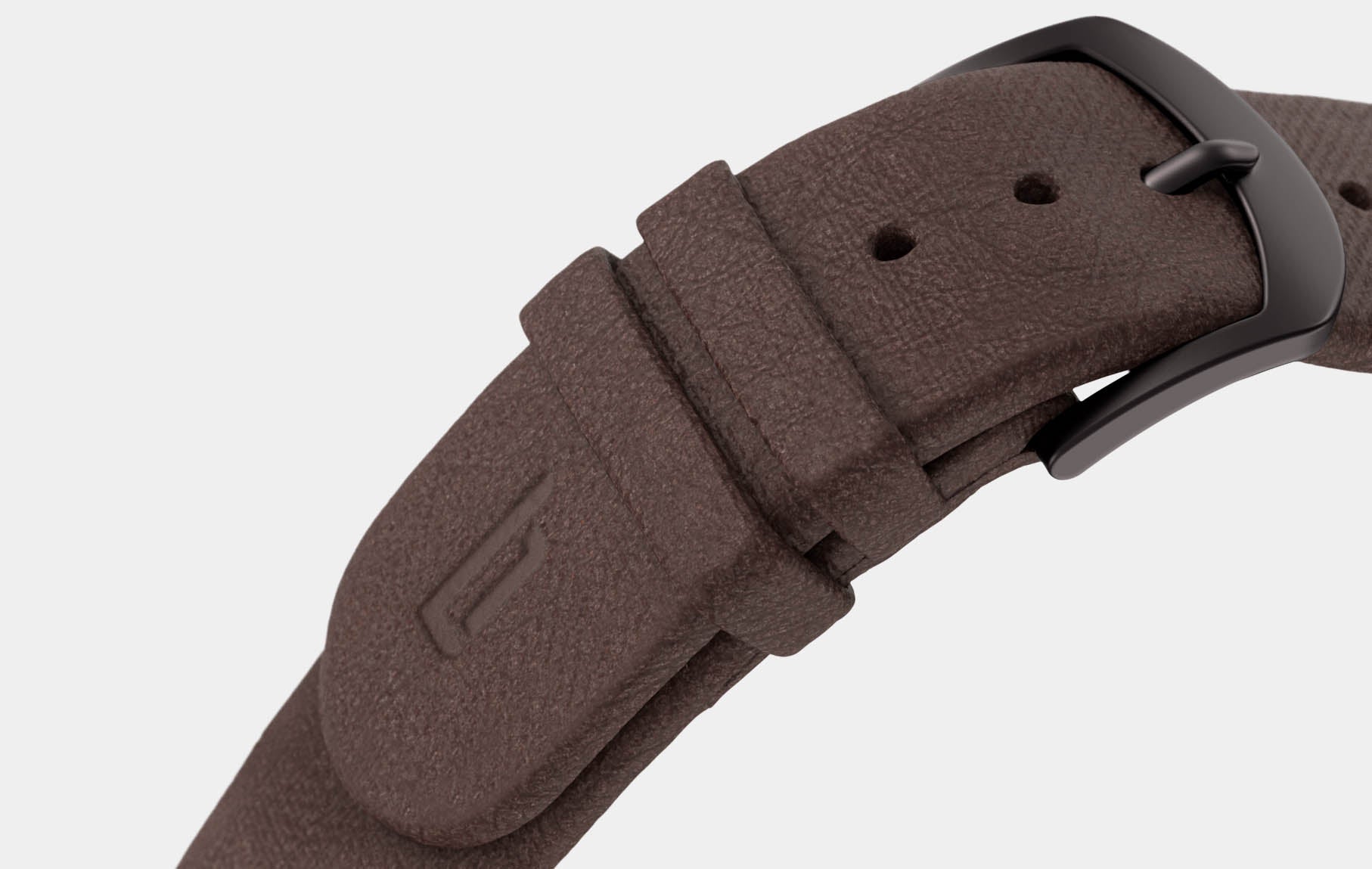 Stylish, resilient and vegan. A mix of cellulose fibers and latex is used for the outer material of the strap. It looks like leather, feels like leather, and yet, it has an entirely unique character. The strap is lined with a cork textile to give it the necessary stability and excellent wear comfort. And thanks to the quick-release mechanism, the strap can be changed in no time.