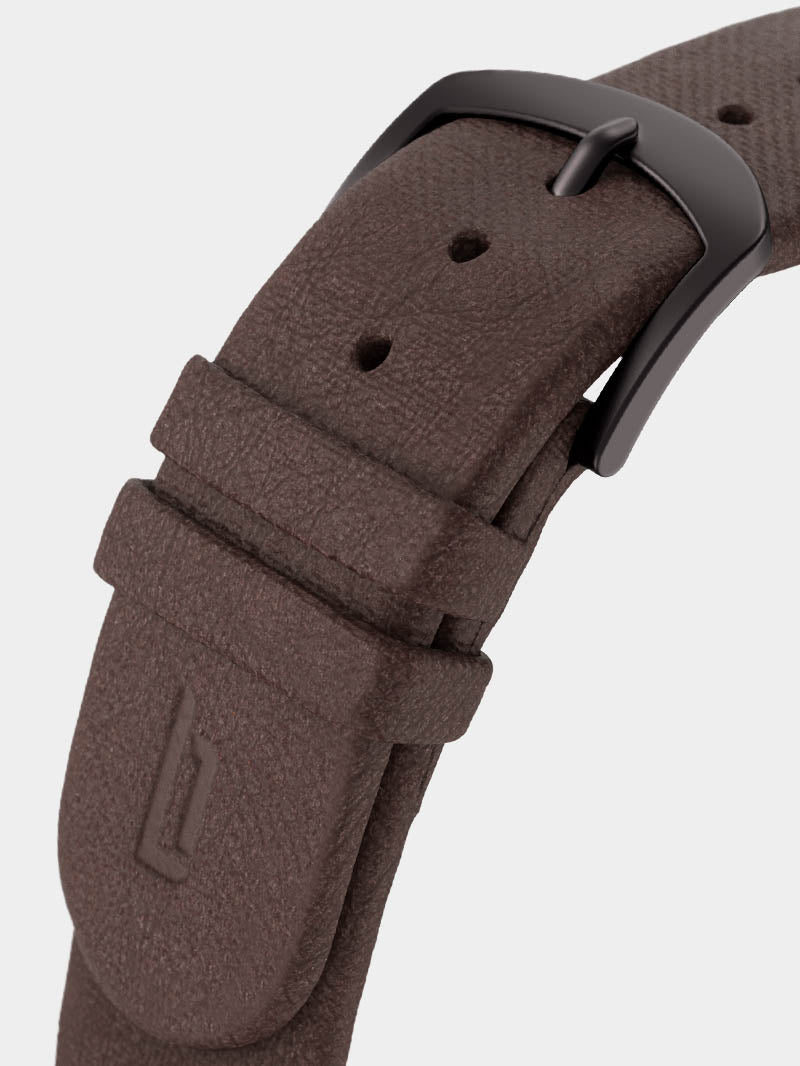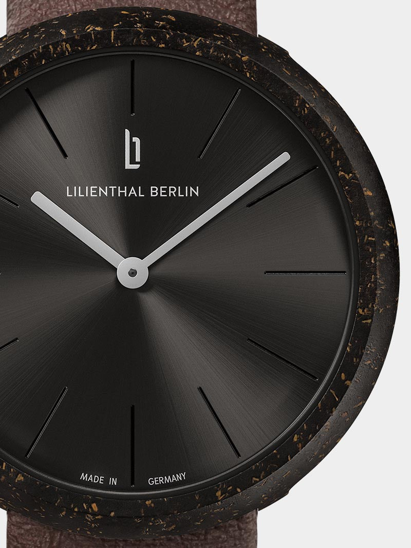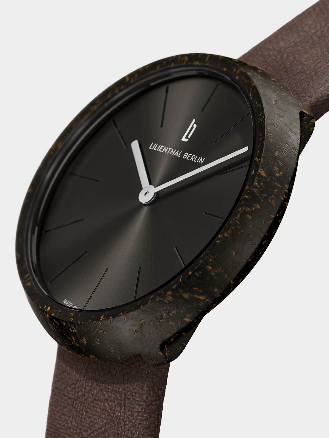 Made of recycled coffee grounds, the watch case is reminiscent of a coffee bean or a coffee cup, depending on how you look at it. The especially round, minimalist appearance of the watch was created using a special trick: the crown is completely recessed into the case back. The pure, straightforward design philosophy is greatly enhanced by the clean, silvery sunburst pattern of the watch face and neatly engraved hour marks.