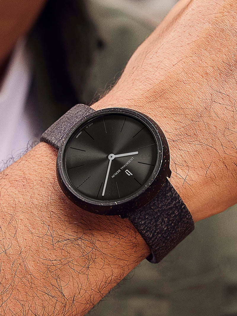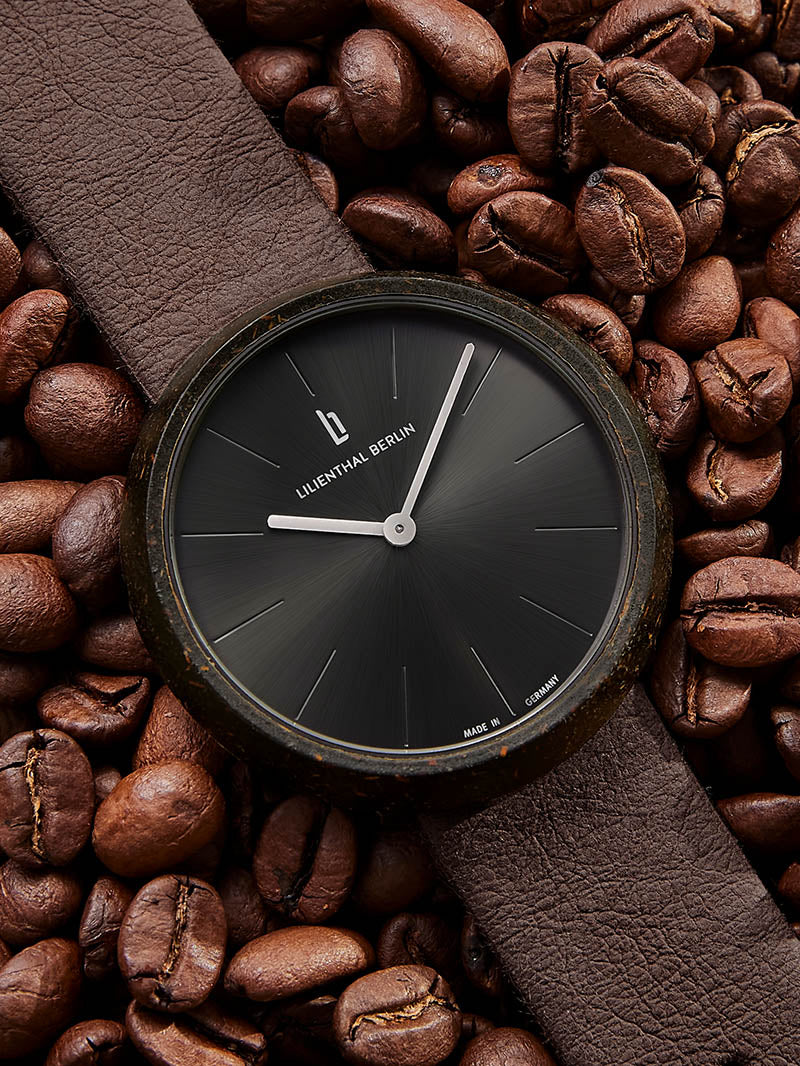 We present the world's first watch made from recycled coffee. When it comes to sustainable living, the Coffee Watch is a true innovation, featuring a case made of used grounds from Berlin cafés and roasting houses, transformed into an extremely durable material through a complex upcycling process. The shapes, colors, texture, and even a subtle aroma reveal what the watch is made of – and it's completely carbon-neutral to boot. All these things make it a genuinely loving tribute to the greatest of all hot drinks!