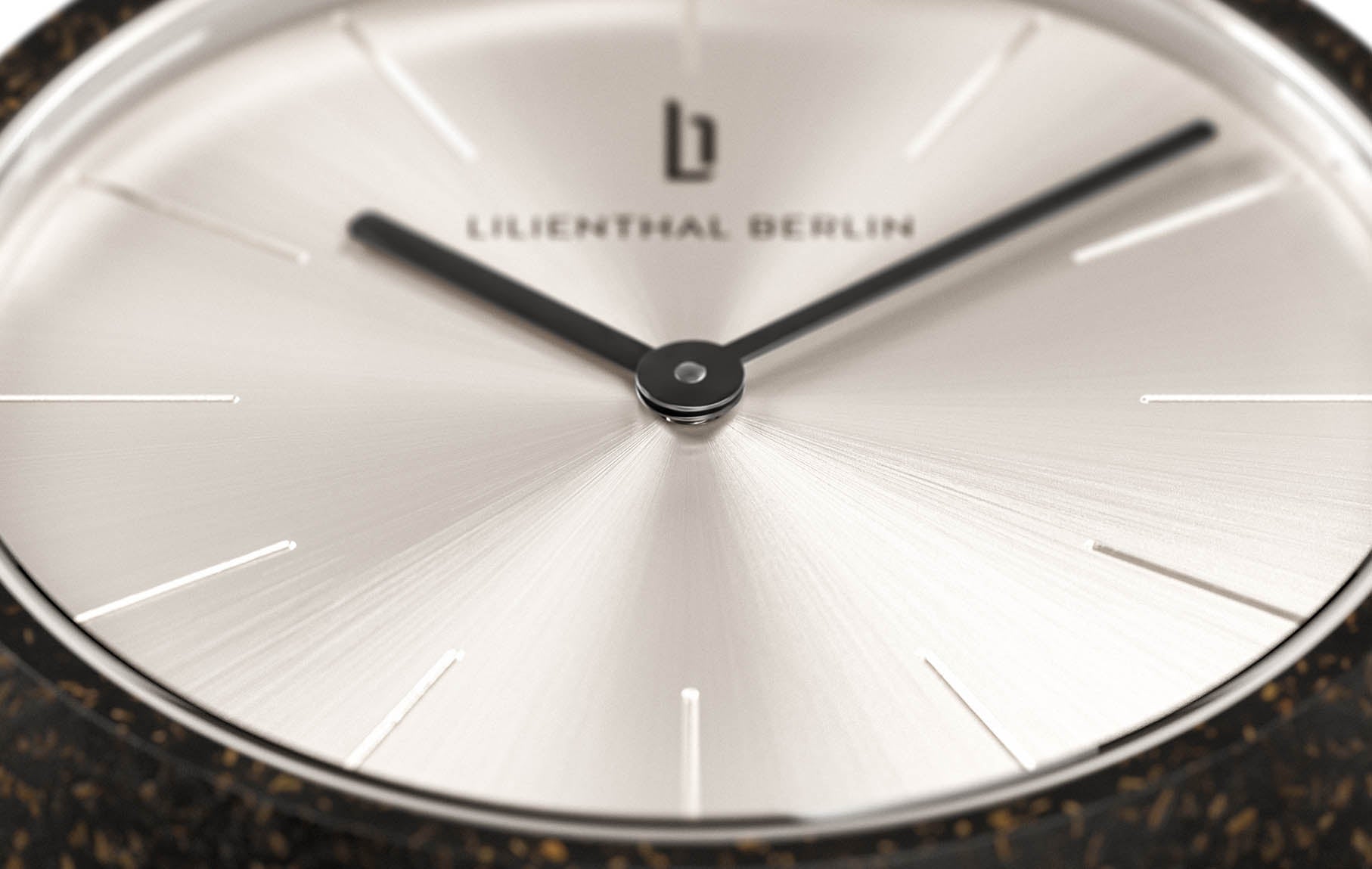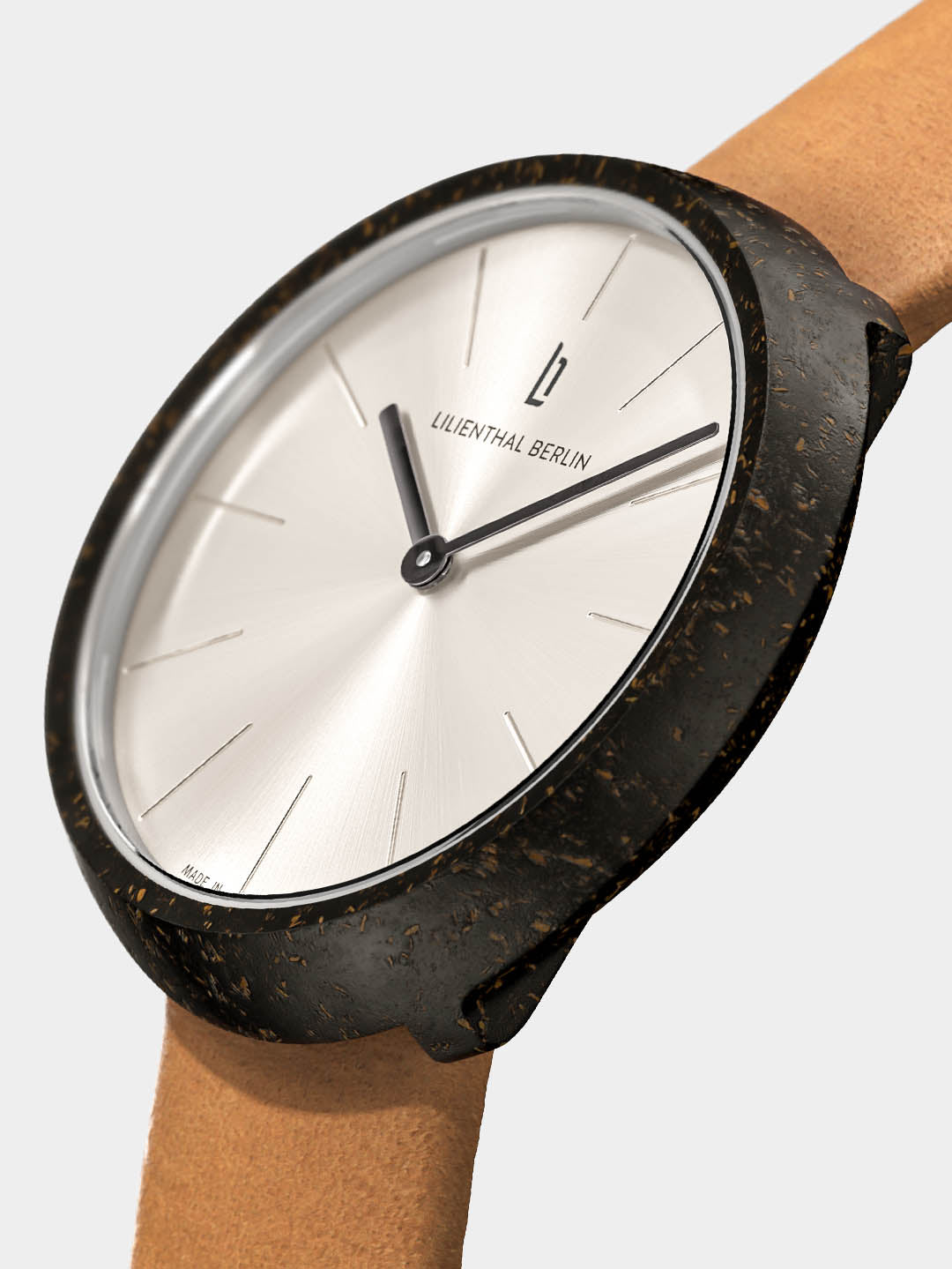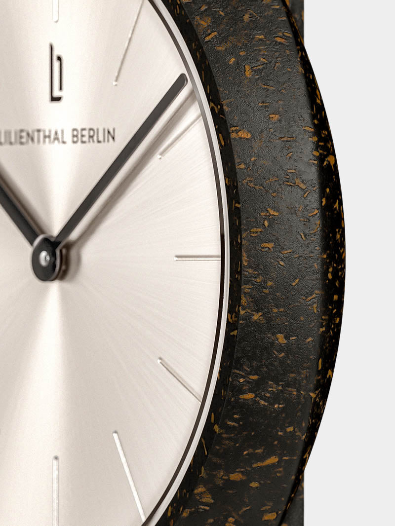 Made of recycled coffee grounds, the watch case is reminiscent of a coffee bean or a coffee cup, depending on how you look at it. The especially round, minimalist appearance of the watch was created using a special trick: the crown is completely recessed into the case back. The pure, straightforward design philosophy is greatly enhanced by the clean, silvery sunburst pattern of the watch face and neatly engraved hour marks.