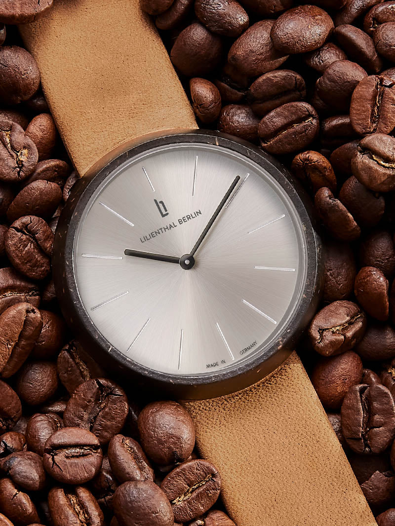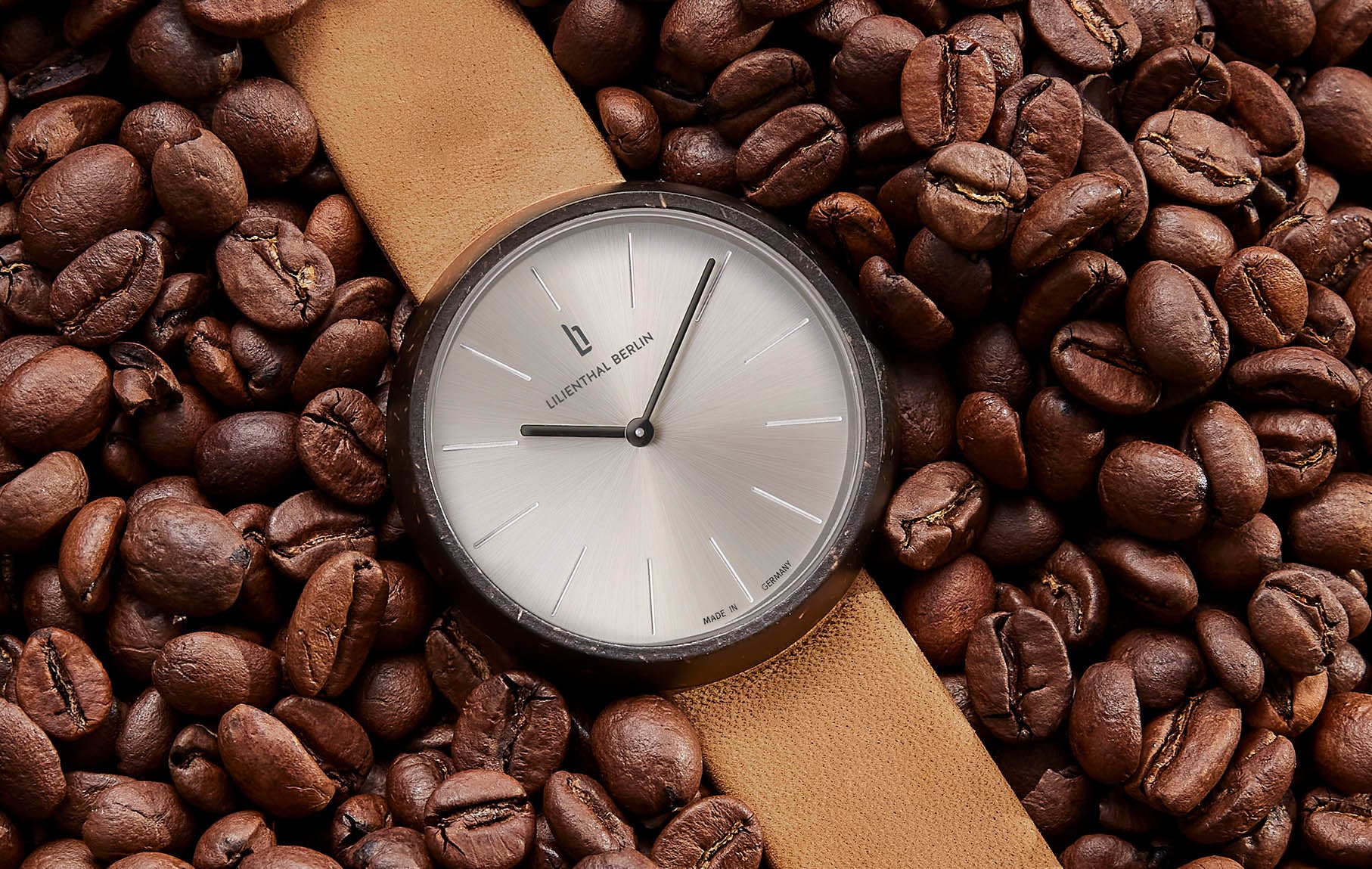 We present the world's first watch made from recycled coffee. When it comes to sustainable living, the Coffee Watch is a true innovation, featuring a case made of used grounds from Berlin cafés and roasting houses, transformed into an extremely durable material through a complex upcycling process. The shapes, colors, texture, and even a subtle aroma reveal what the watch is made of – and it's completely carbon-neutral to boot. All these things make it a genuinely loving tribute to the greatest of all hot drinks!