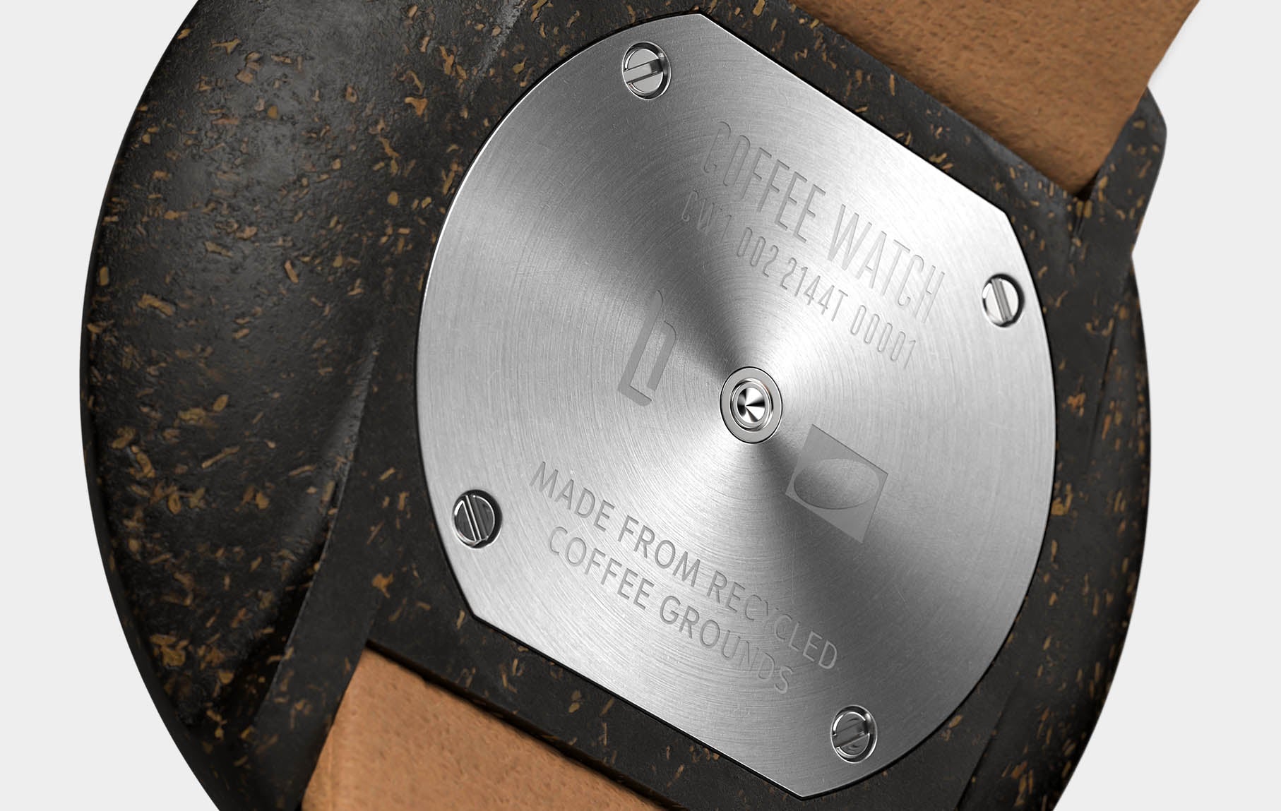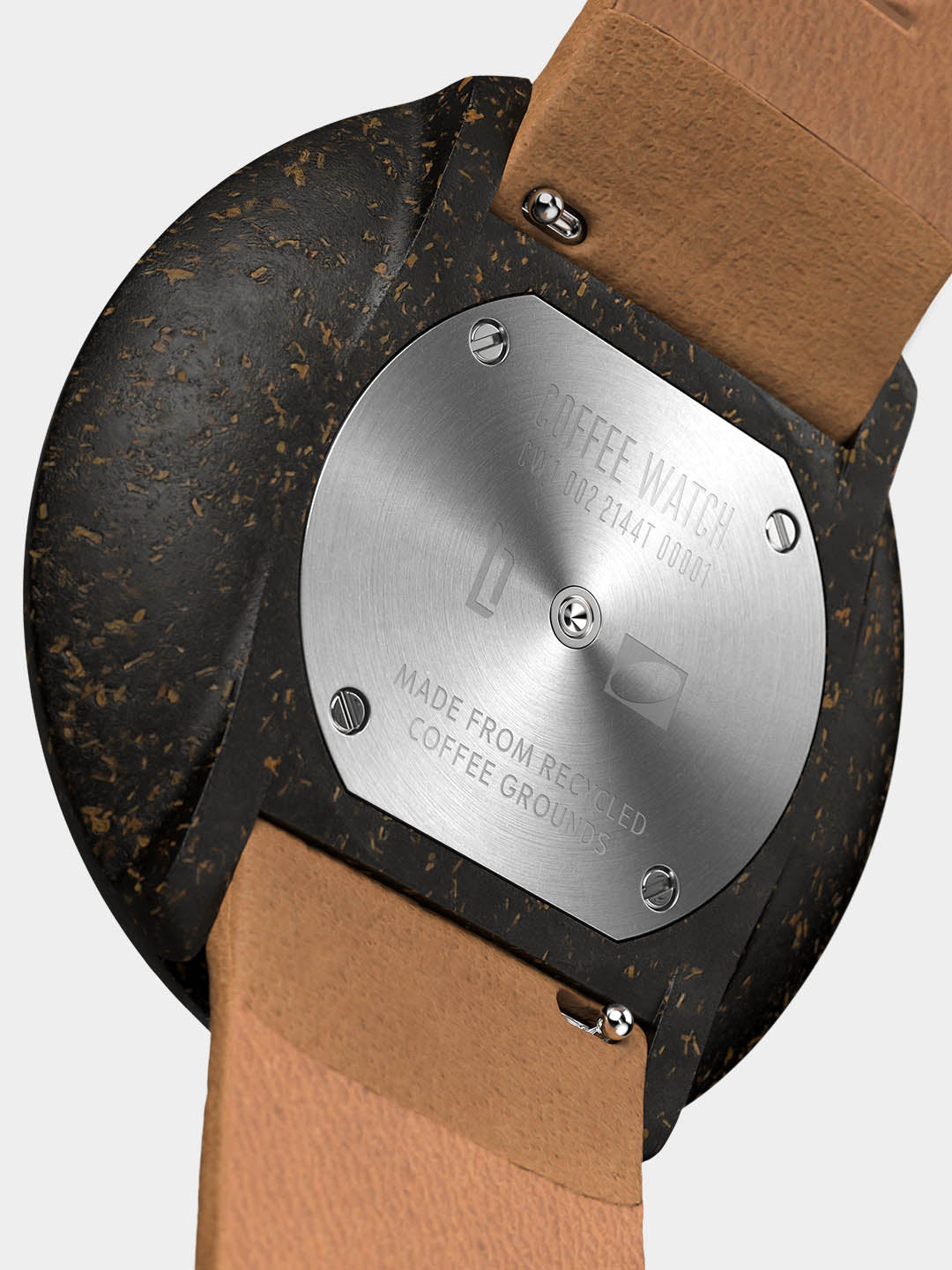 The watch case is made from used coffee grounds, which are transformed into a durable material using a unique upcycling process developed by Kaffeeform.