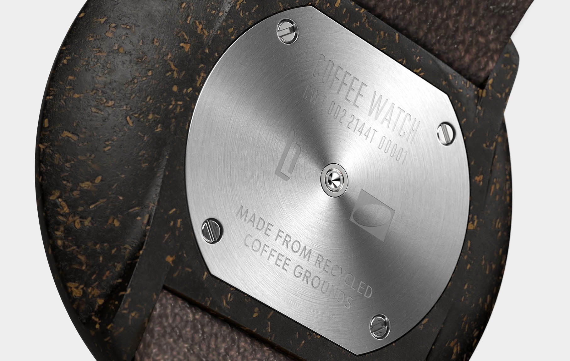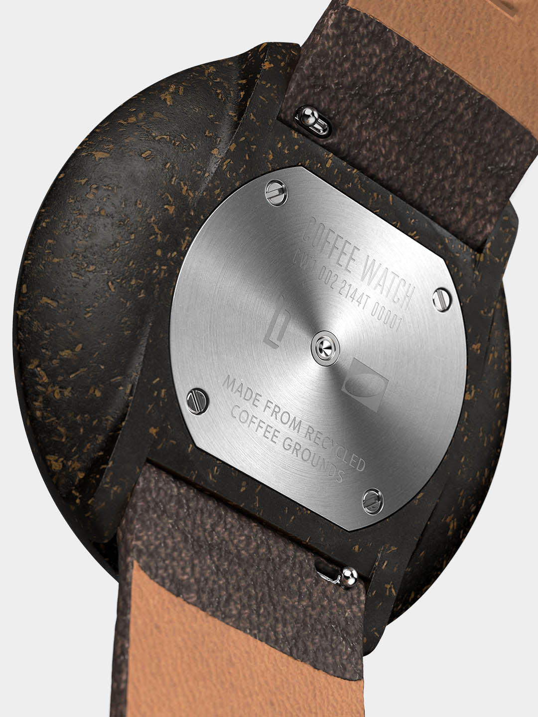 The watch case is made from used coffee grounds, which are transformed into a durable material using a unique upcycling process developed by Kaffeeform.