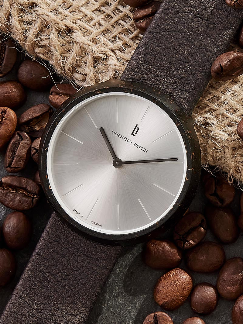 We present the world's first watch made from recycled coffee. When it comes to sustainable living, the Coffee Watch is a true innovation, featuring a case made of used grounds from Berlin cafés and roasting houses, transformed into an extremely durable material through a complex upcycling process. The shapes, colors, texture, and even a subtle aroma reveal what the watch is made of – and it's completely carbon-neutral to boot. All these things make it a genuinely loving tribute to the greatest of all hot drinks!