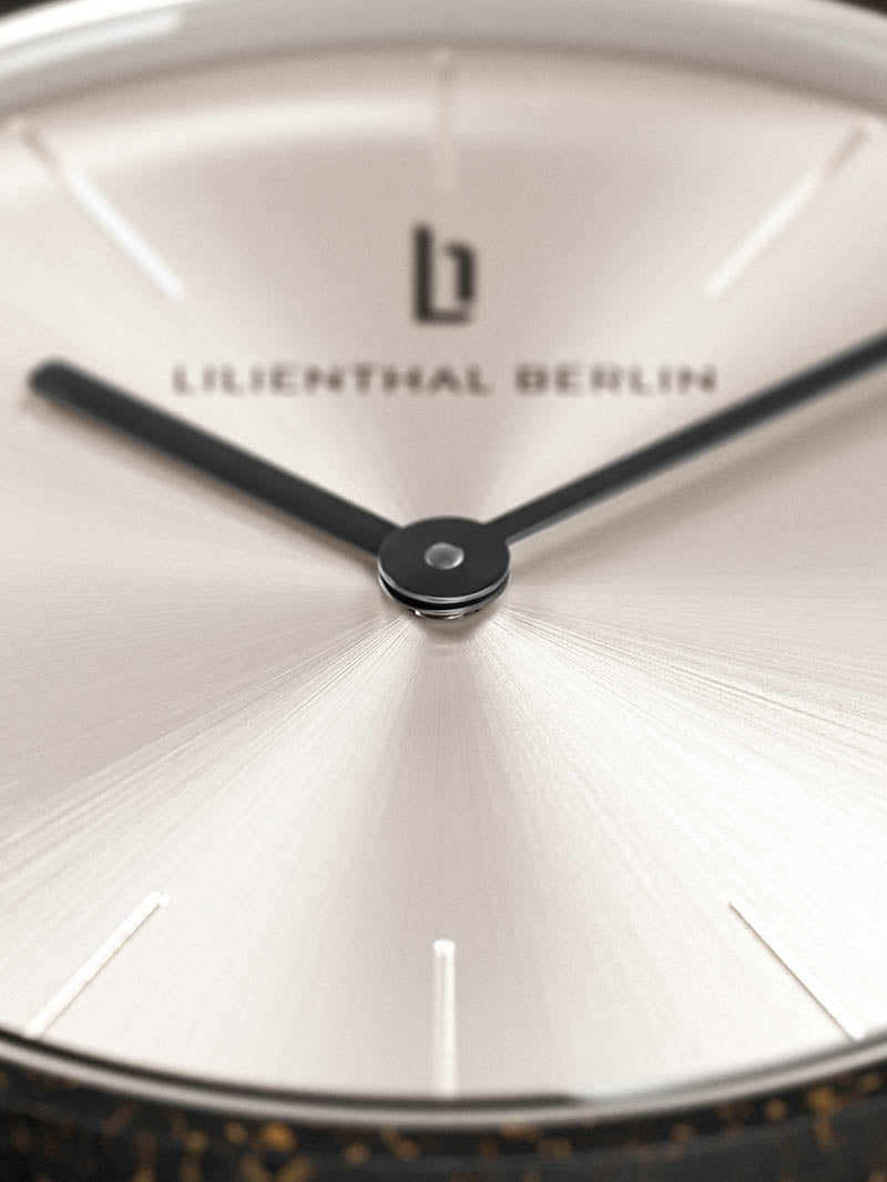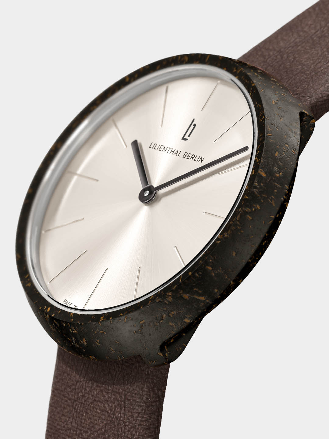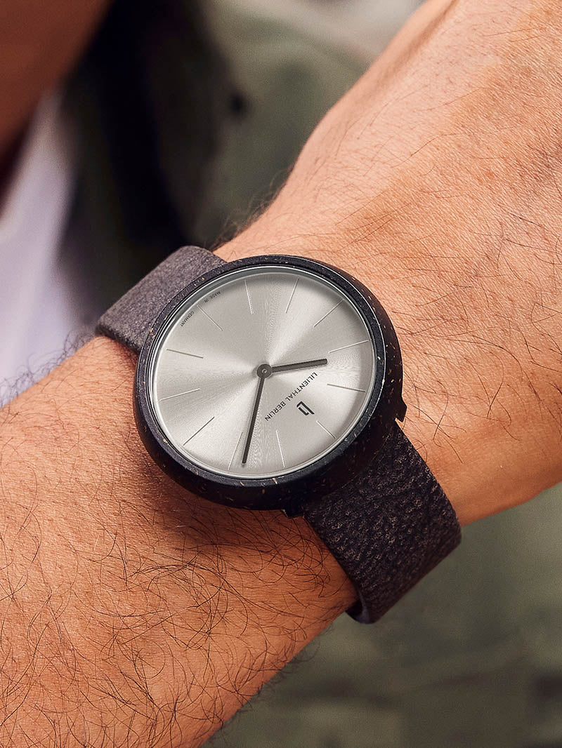 Made of recycled coffee grounds, the watch case is reminiscent of a coffee bean or a coffee cup, depending on how you look at it. The especially round, minimalist appearance of the watch was created using a special trick: the crown is completely recessed into the case back. The pure, straightforward design philosophy is greatly enhanced by the clean, silvery sunburst pattern of the watch face and neatly engraved hour marks.
