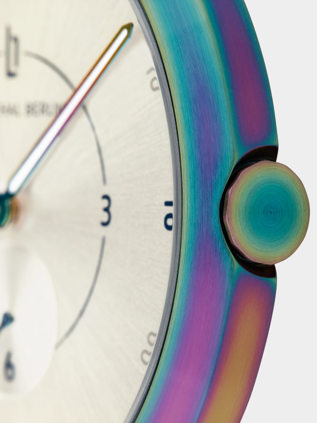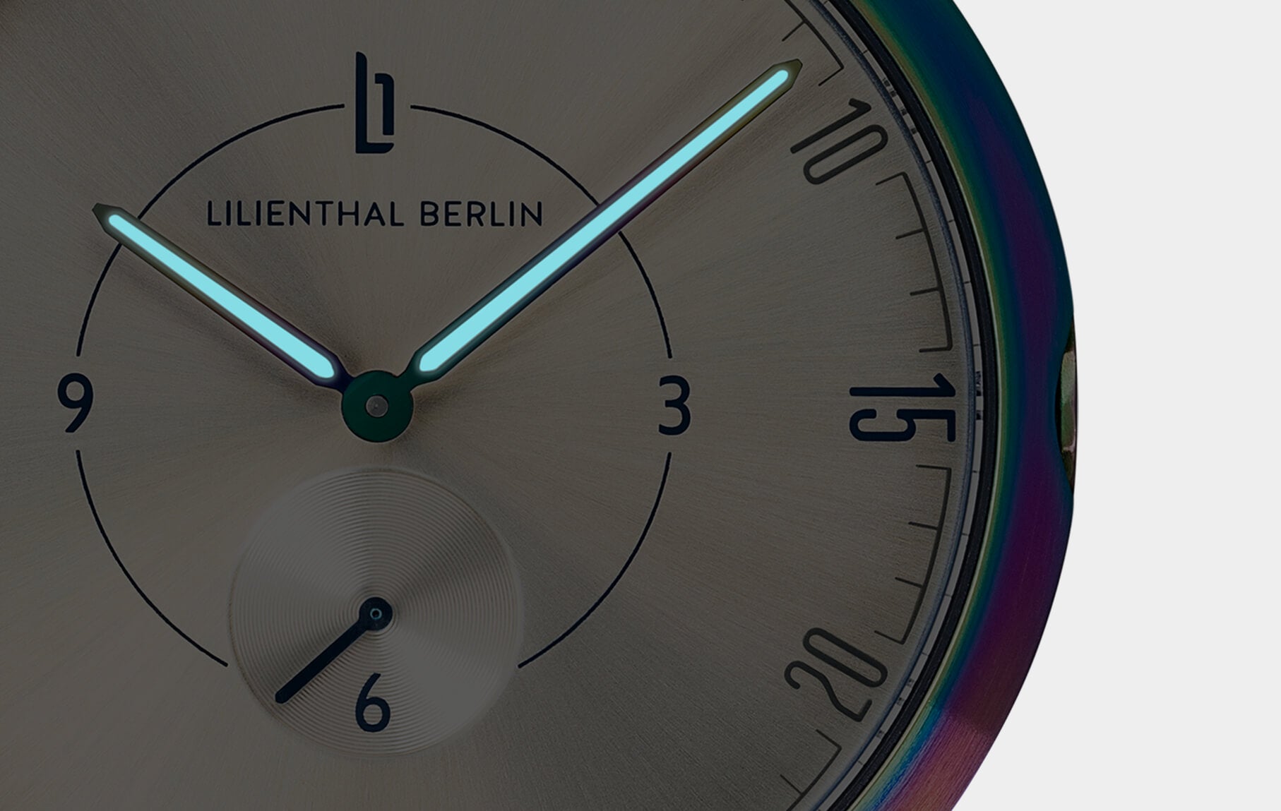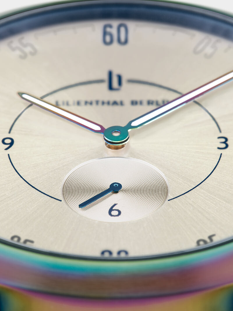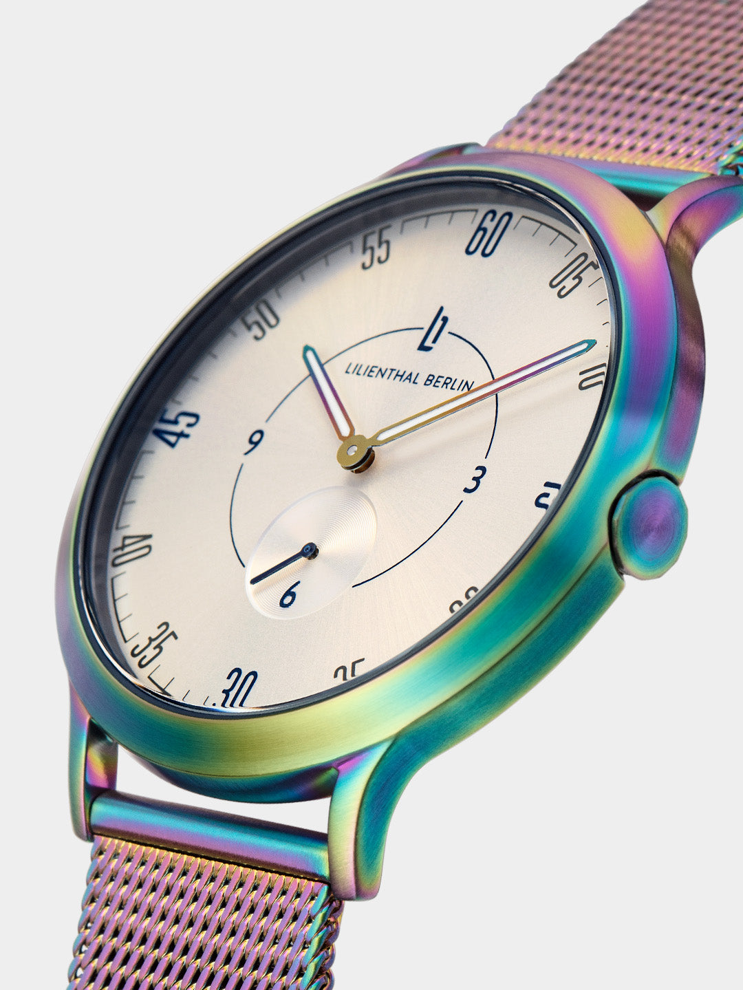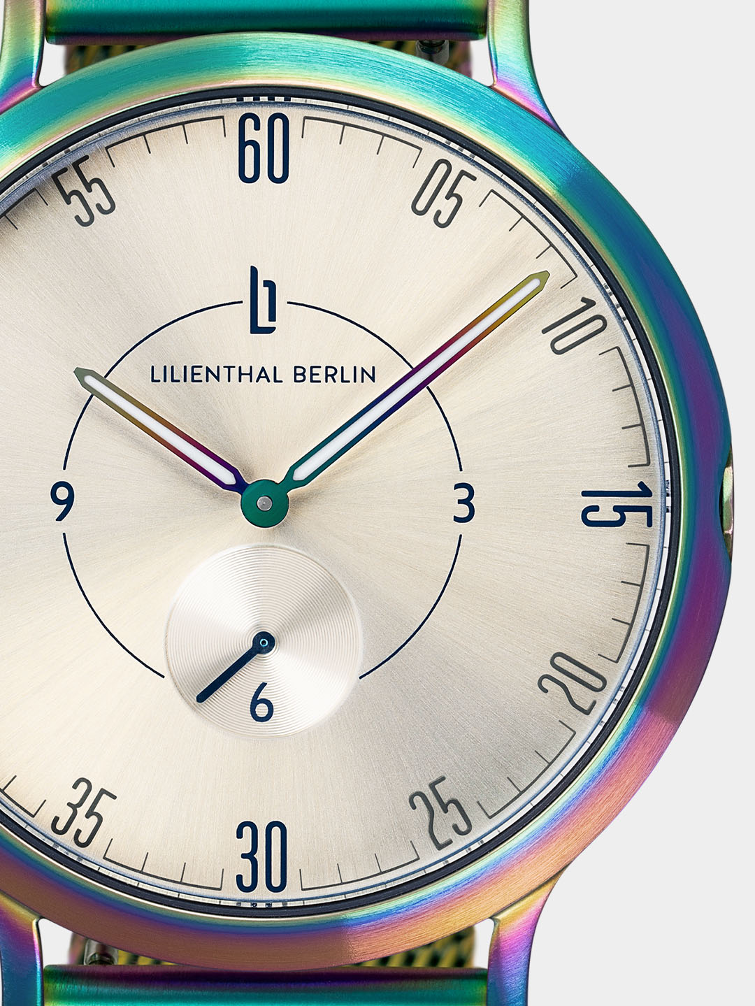 We have outdone ourselves with the color. The color gradient on the casing and hands is entirely random. If you own an Lilienthal 1 Rainbow, rest assured that there is no other watch like yours! Its colorful shimmering pervades through its sun-cut dial, which shows a different color shading per angle. Individualism and free thinking doesn't get any more charming than this!