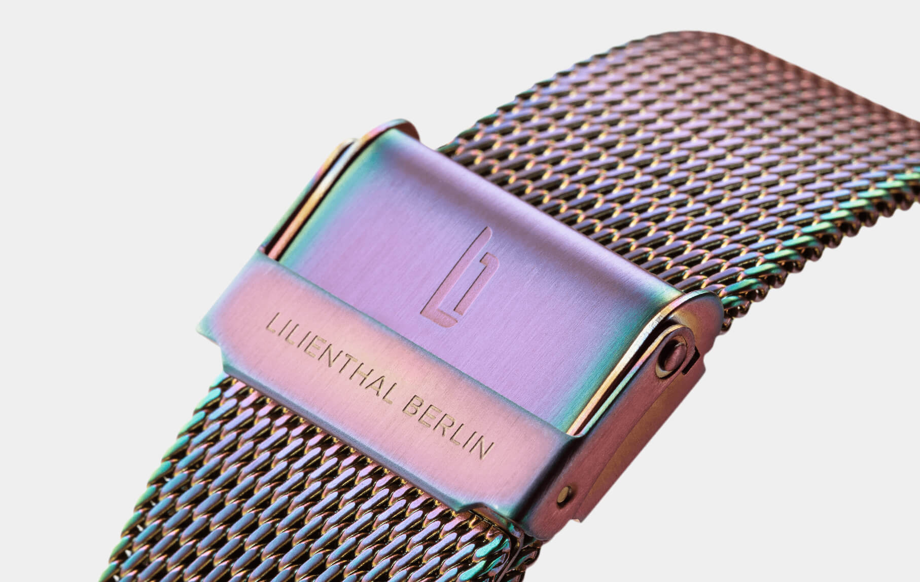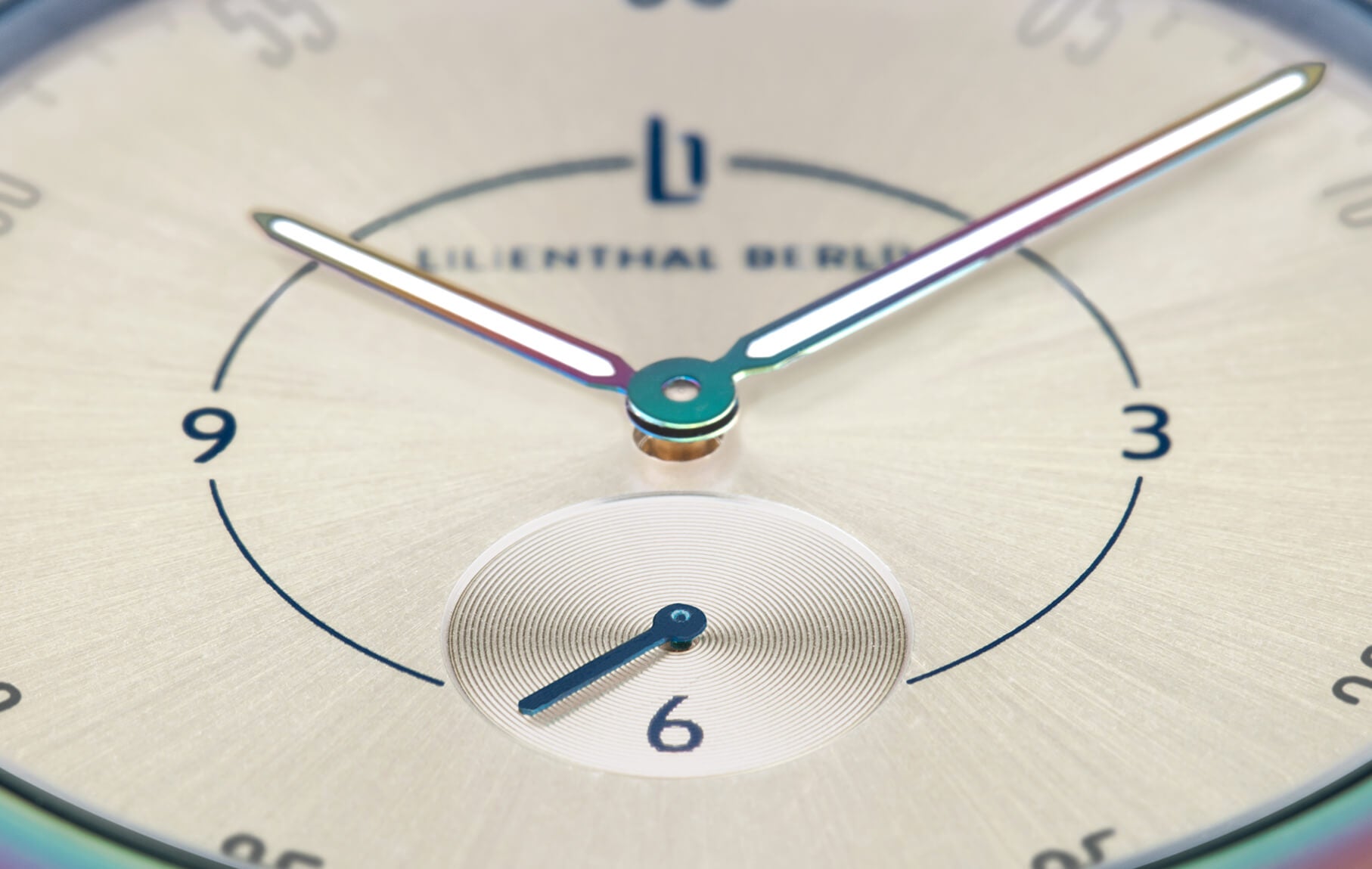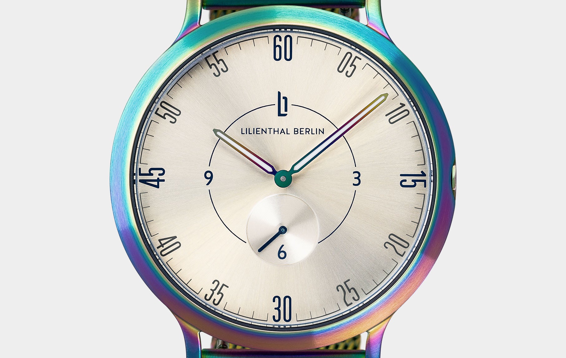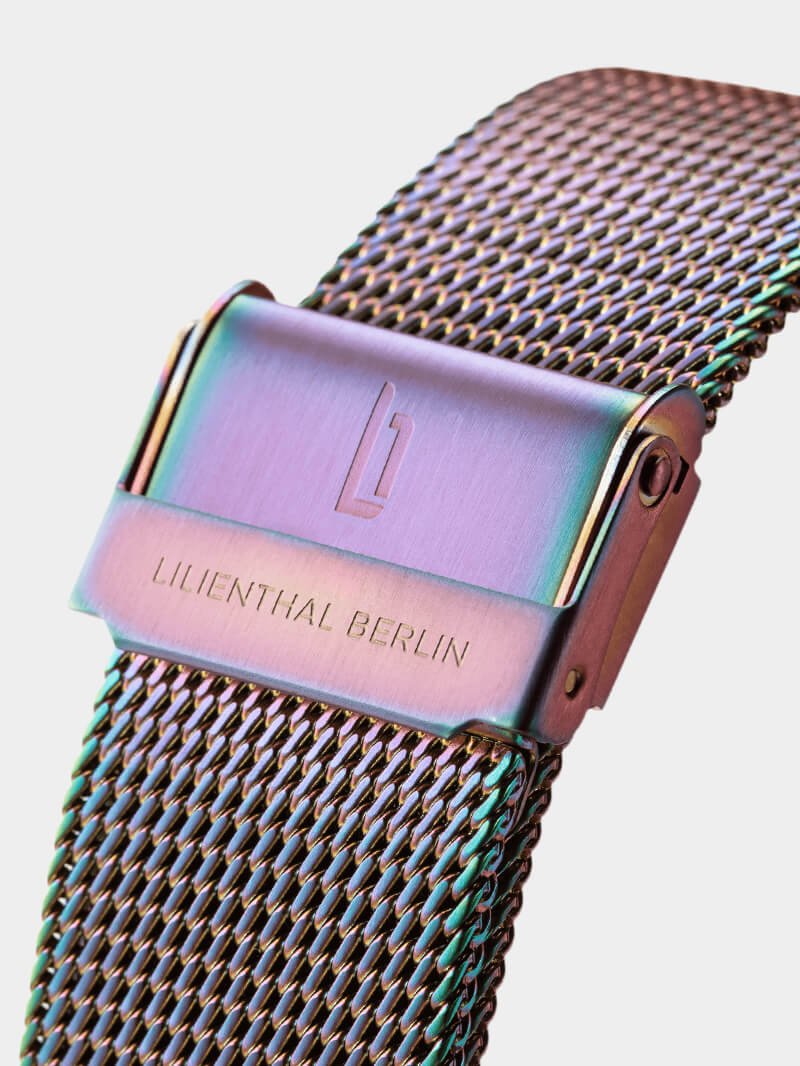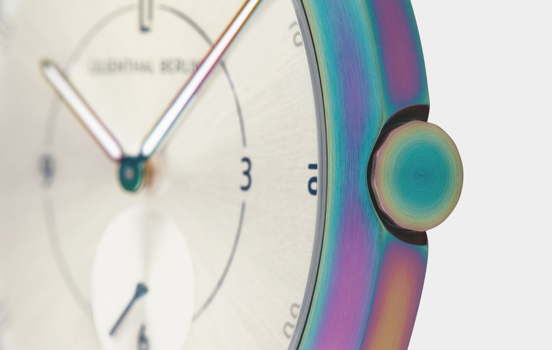 We have outdone ourselves with the color. The color gradient on the casing and hands is entirely random. If you own an Lilienthal 1 Rainbow, rest assured that there is no other watch like yours! Its colorful shimmering pervades through its sun-cut dial, which shows a different color shading per angle. Individualism and free thinking doesn't get any more charming than this!