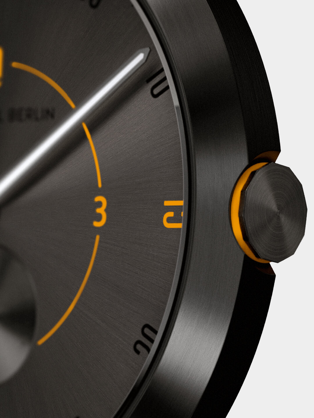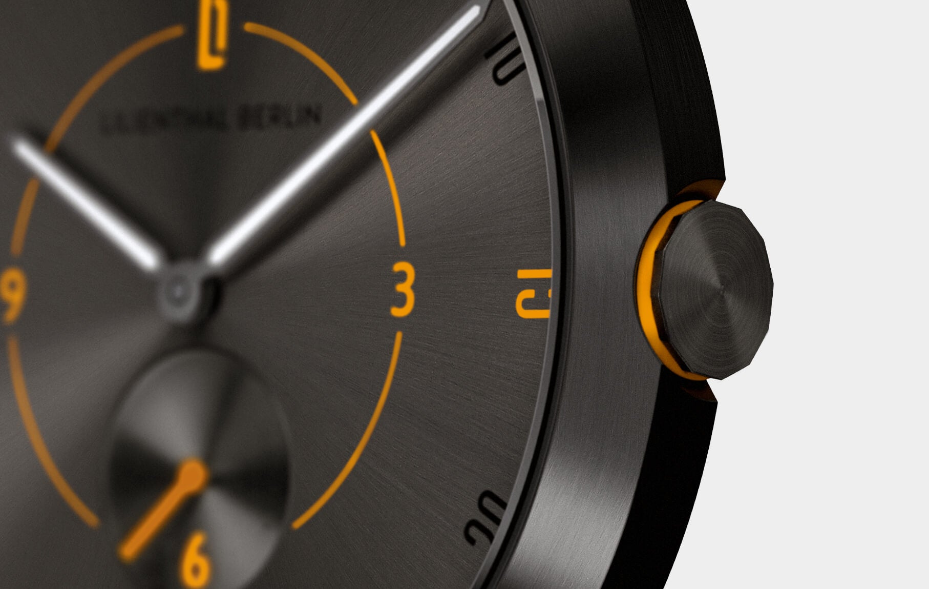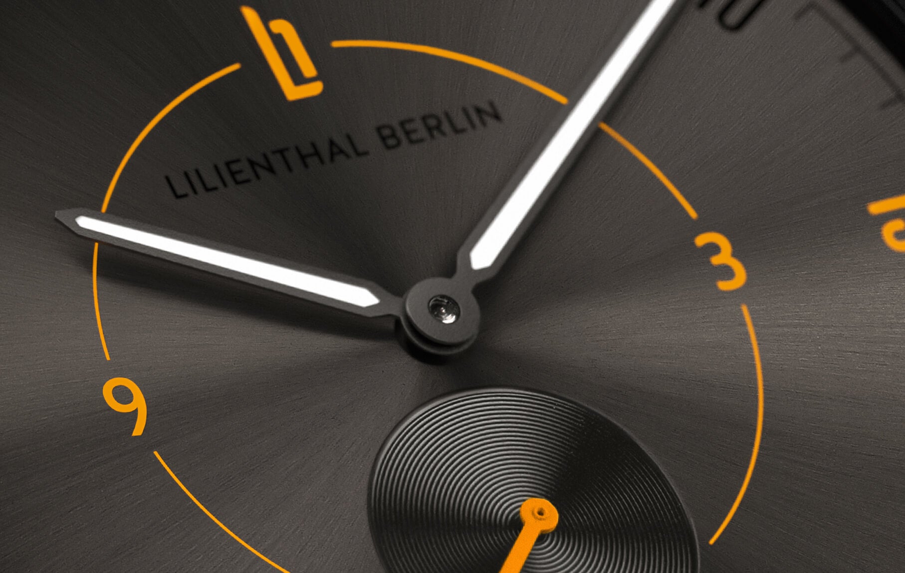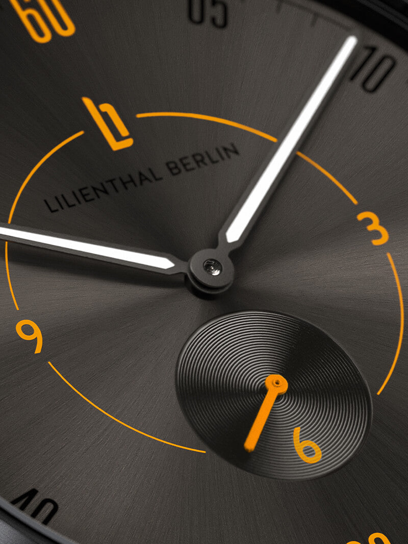 The crown embedded in the case. The indices in the same typography found on Berlin’s street signs. The seconds dial that draws your attention to the moment. These are the little details that help the Lilienthal 1 make a big impact, winning several national and international design awards. The dark gunmetal case and bright orange details provide for the ultimate fiery flash and flair!