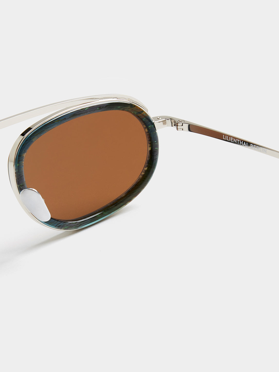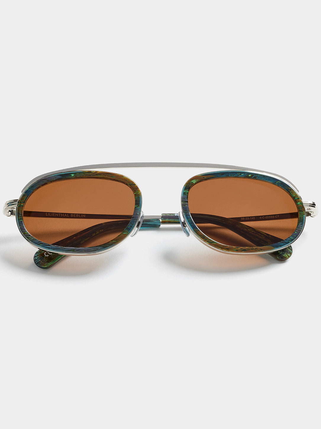 The Complextro presents a fresh perspective on the iconic aviator style. What immediately catches the eye is its unconventional and dynamic design – oval lenses connected at the top of the frame, departing from the traditional nose bridge. This unique approach ensures exceptional comfort. But that's not all: the fluid contours of the organic acetate also exude an air of elegance and sporty sophistication.